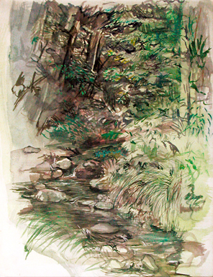 友人たちに作品を披露していたところ、教授が覗き込み、「良く描けているね」と、大学に入って初めて、直々にお誉めの言葉を頂けた絵ではあります。今となっては、水面の表現を始めとして稚拙さが目立つ絵ですが、鬱蒼とした山中の小川の臨場感はそこそこ描けていると思います。