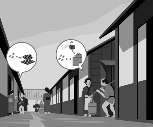 江戸時代の、江戸の経済について紹介した特集の扉絵です。(A4変形・1Cページ・2004年)